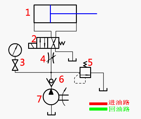油路說明:在進油管路上設(shè)置節(jié)流閥,控制液壓油流量,進而控制活塞桿移動速度