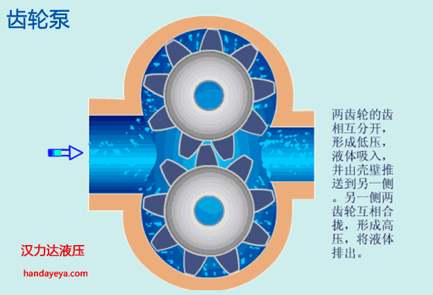 液壓泵包含齒輪泵、葉片泵、柱塞泵、螺桿泵。以下動畫演示油泵工作原理