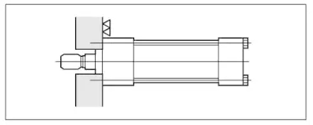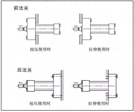 ?。?)法蘭安裝適合于液壓缸工作過程中固定式安裝,其作用力與支承中心處于同一軸線的工況;其安裝方式選擇位置有端部、中部或尾部三種,如何選擇取決作用于負載的主要作用力對活塞桿造成壓縮(推)應(yīng)力、還是拉伸(拉)應(yīng)力,一般壓縮(推)應(yīng)力采用尾部、中部法蘭安裝,拉伸(拉)應(yīng)力采用端部、中部法蘭安裝,確定采用端部、中部或尾部法蘭安裝需同時結(jié)合系統(tǒng)總體結(jié)構(gòu)設(shè)計要求和長行程壓縮(推)力工況的液壓缸彎曲穩(wěn)定性確定。